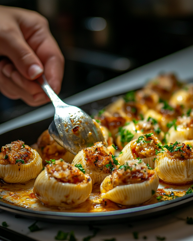 Each shell holds a hearty mixture that balances protein, dairy, and herbs. The dish carries a homestyle character, with layers of flavor built from simple kitchen staples. A warm tomato base supports the stuffed pasta, while melted cheese ties everything together into a cohesive baked meal.