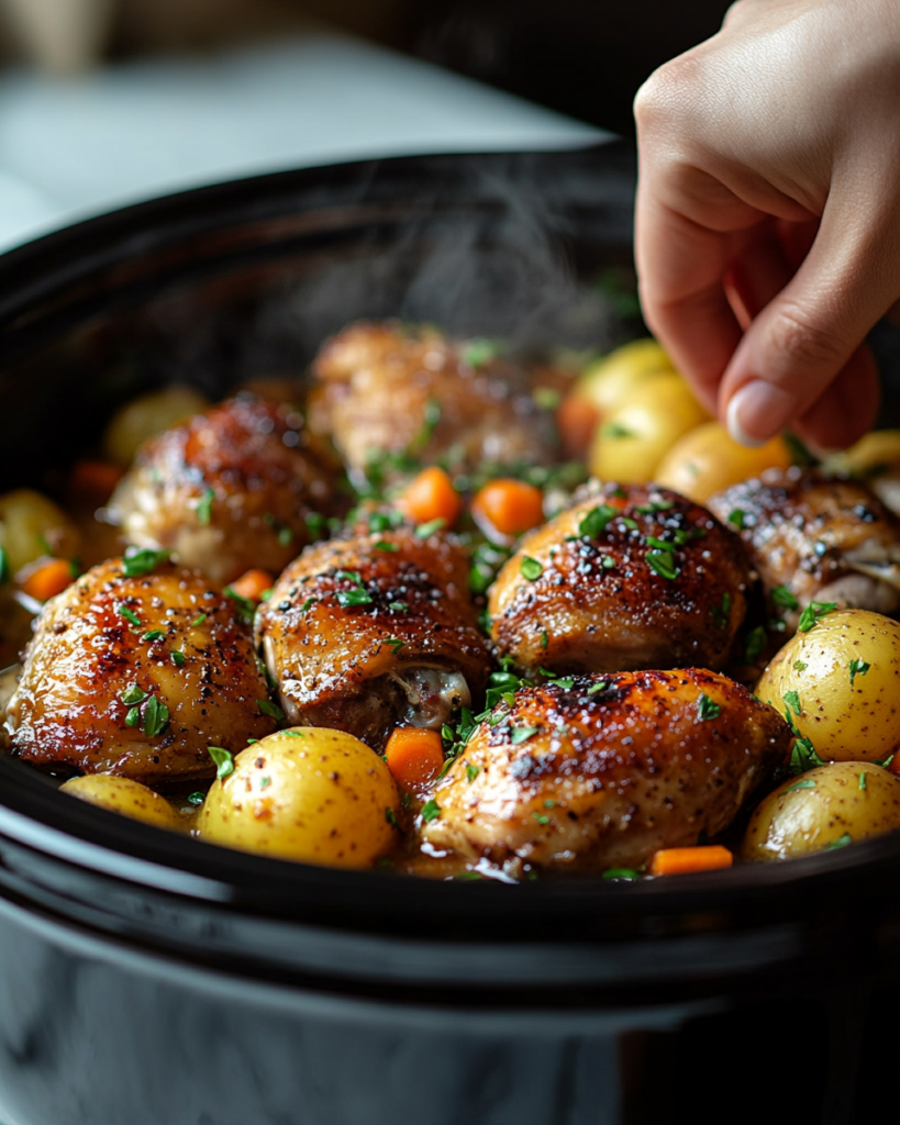 Cover and cook on low for 6–7 hours or on high for 3–4 hours, until the chicken is tender and the potatoes are soft.