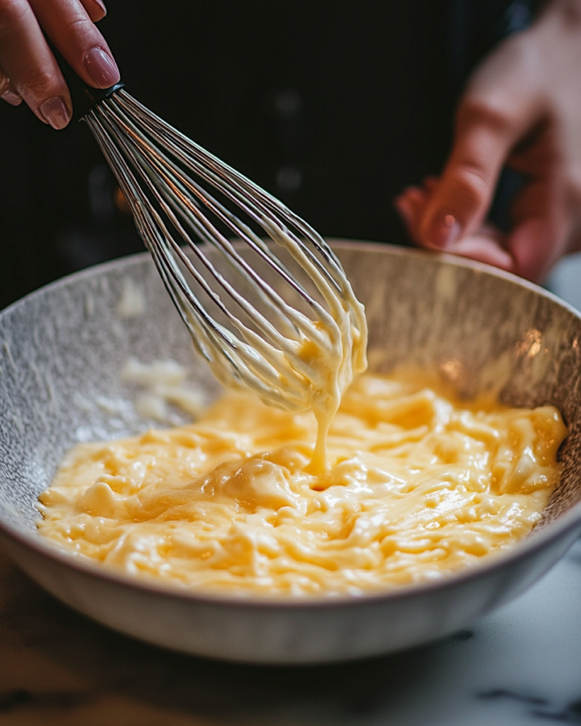 A butter-based roux thickens the sauce. Flour is cooked briefly in melted butter before milk is added, forming the base of the cheese sauce. This step is important because it helps the sauce stay stable during baking.