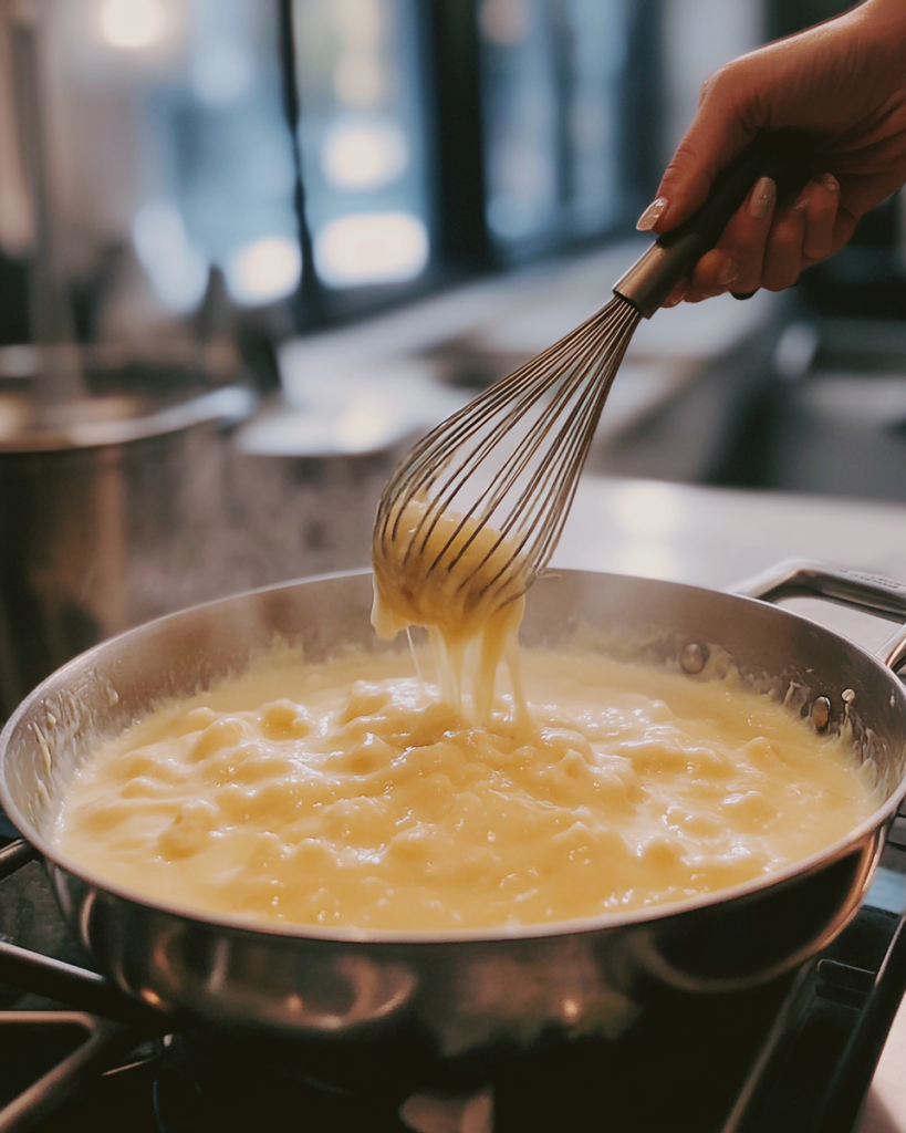 Slowly pour in the milk while whisking to avoid lumps. Continue cooking for 3–5 minutes until the mixture thickens slightly.